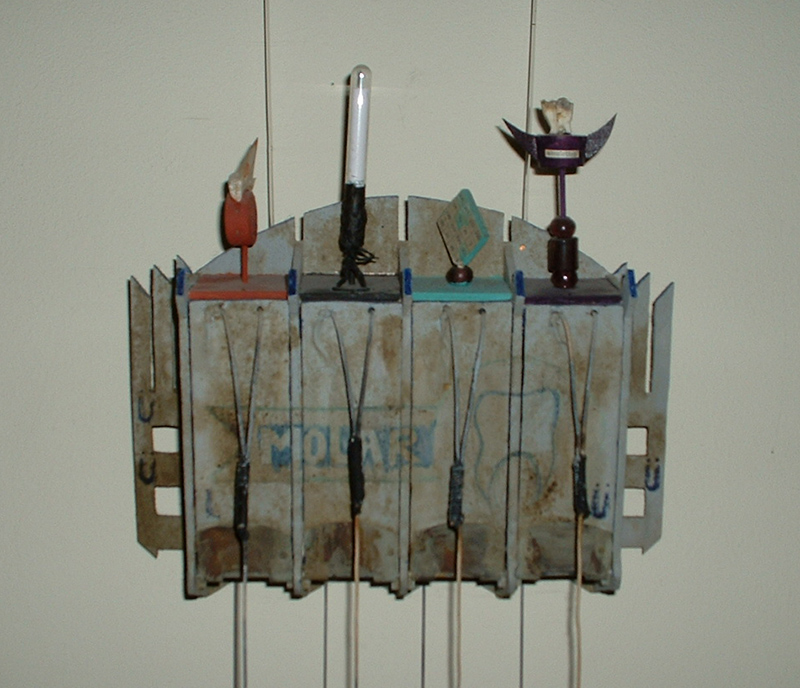 2004 – Molar DescriptionMade for a friend of mine to give a fitting place to her (just extracted) wisdom teeth. 2004circa 30 x 20 x 8 cm.Assemblage of 4 wisdom teeth and various materials