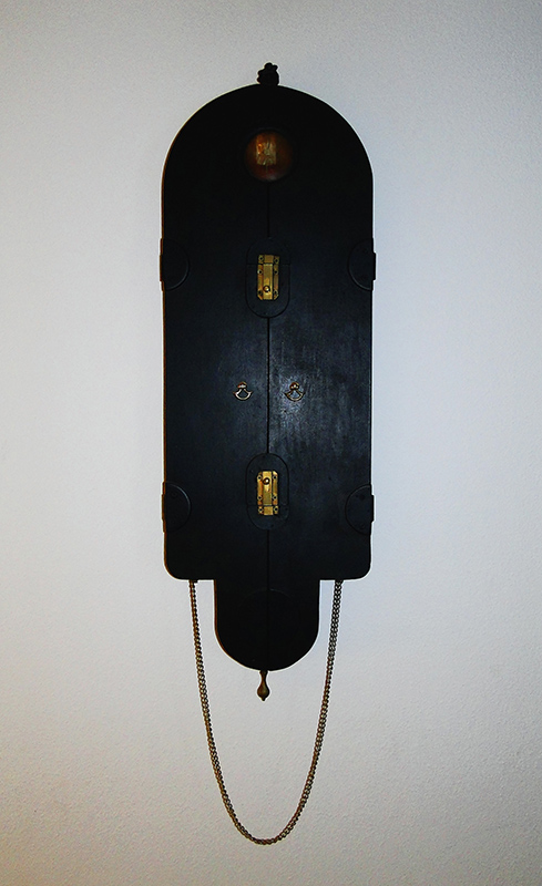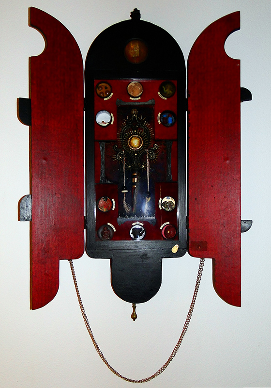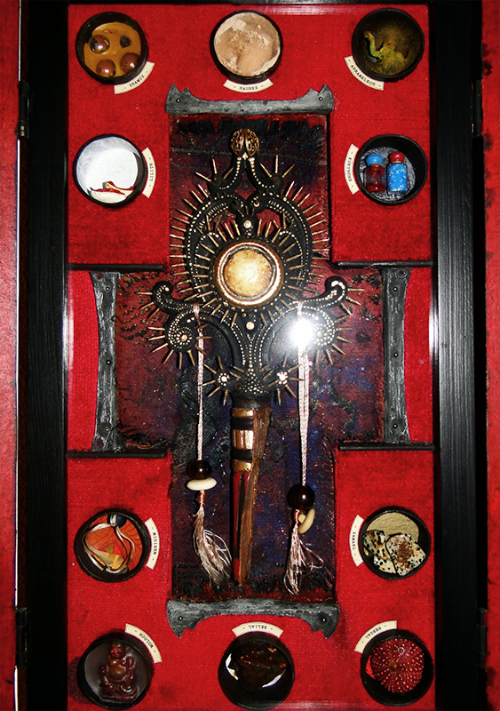 This baroque hellish reliquary was made for a couple of friends of mine. In my hurry to finish it I cracked the front pane of glass; these pictures are from the repaired version.