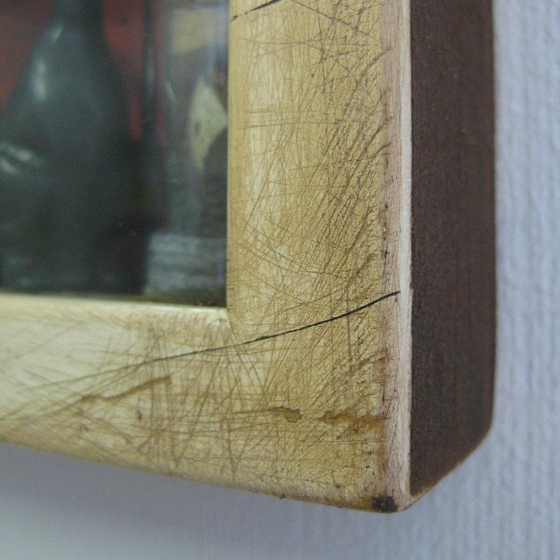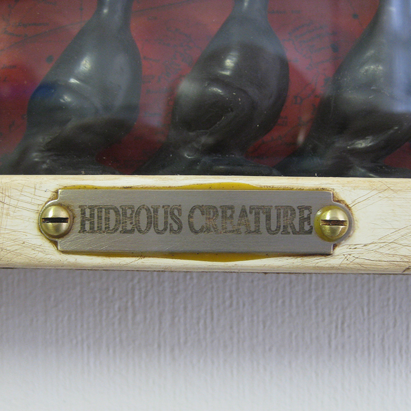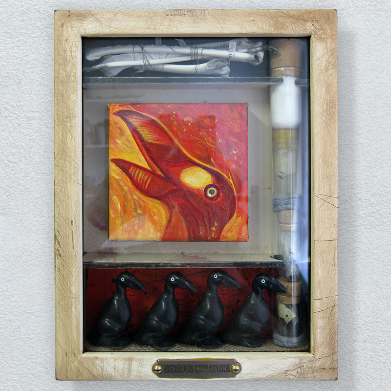 Assemblage of wood, glass, feathers, bones, polymer clay and acrylics.