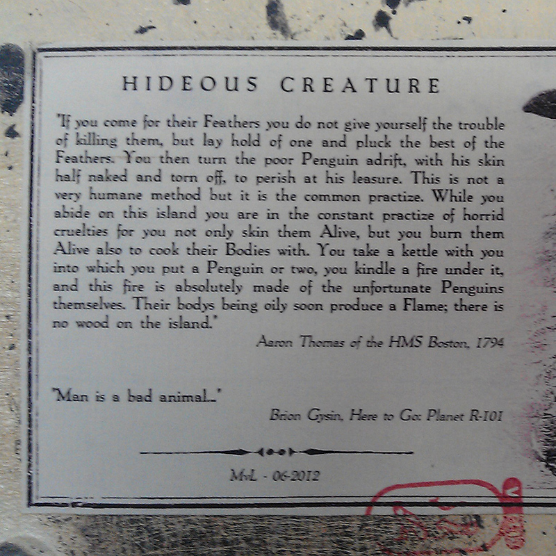 The Great Auk was a magnificent flightless bird that was murdered to extinction for its’ feathers and fat. The account of Auk harvesting I stuck to the back of this piece is especially chilling.