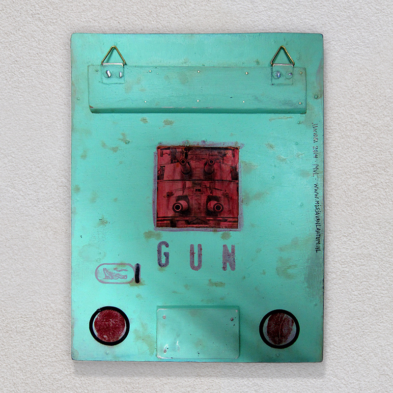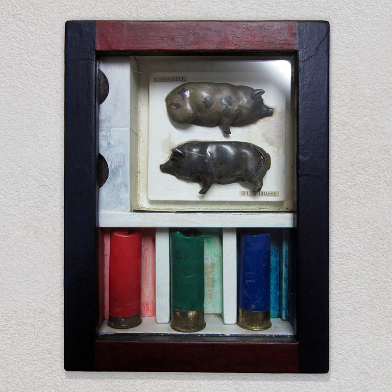 Assemblage of wood, glass, pewter, plastic and acrylics.