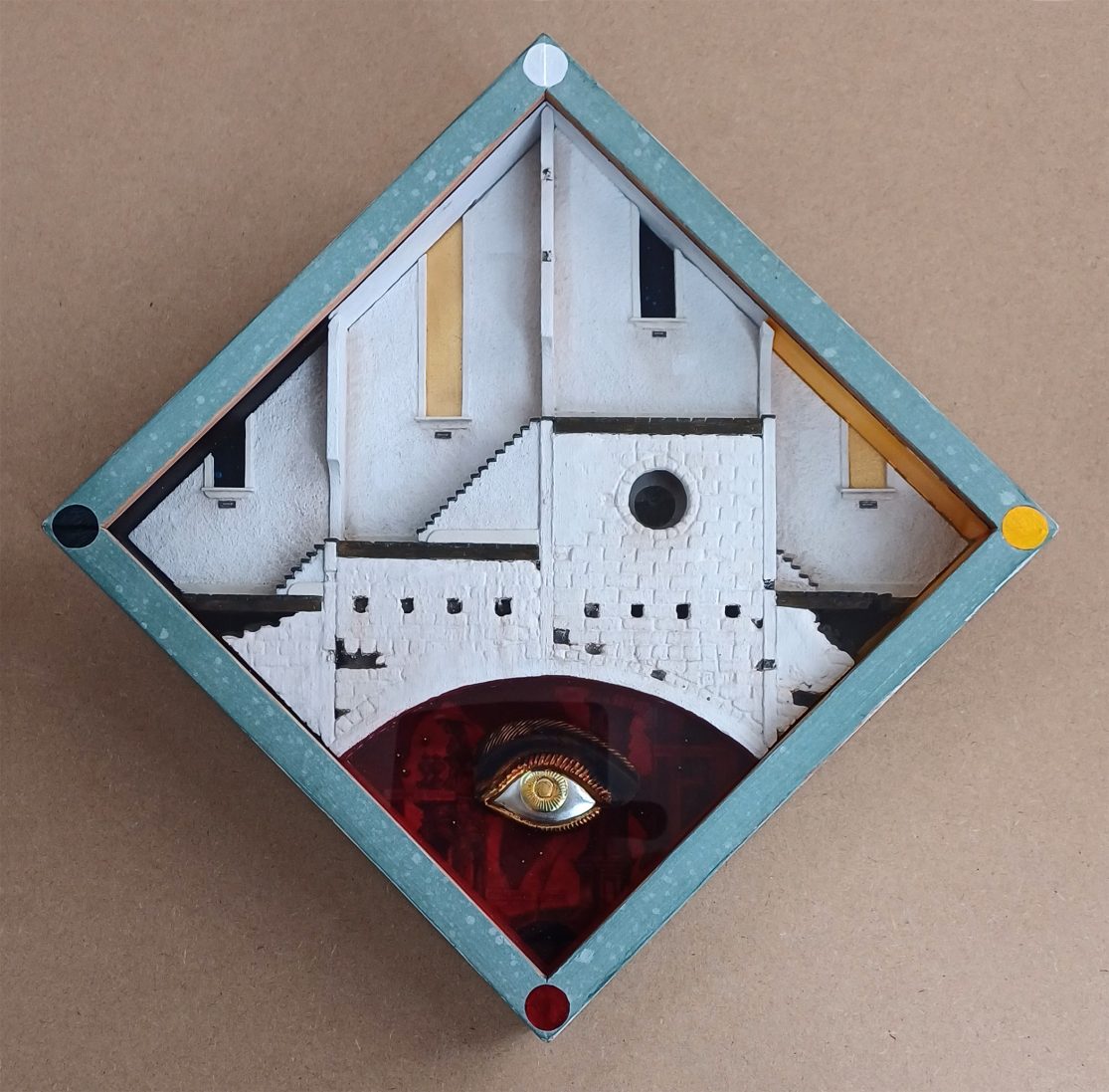 This work is – in style and theme – related to a previous work: Everywhen. This work deals with levels of consciousness and subconsciousness in our minds. It deals with compartimentalisation. In short it deals with the rooms we have in our mind. The places where we store memories, desires, opinions, etc. I had a bunch of fun building this one as it fully engaged my love for miniatures and navel gazing detailing.