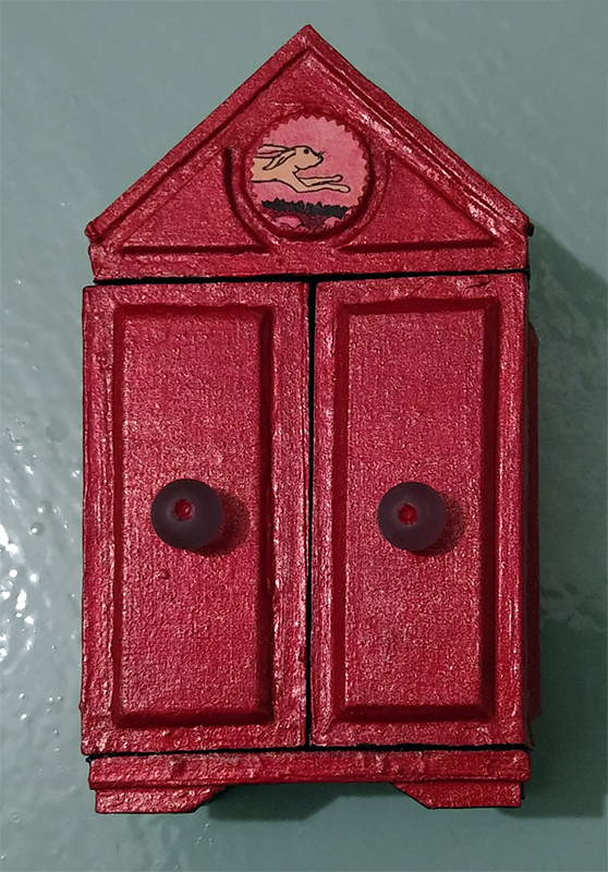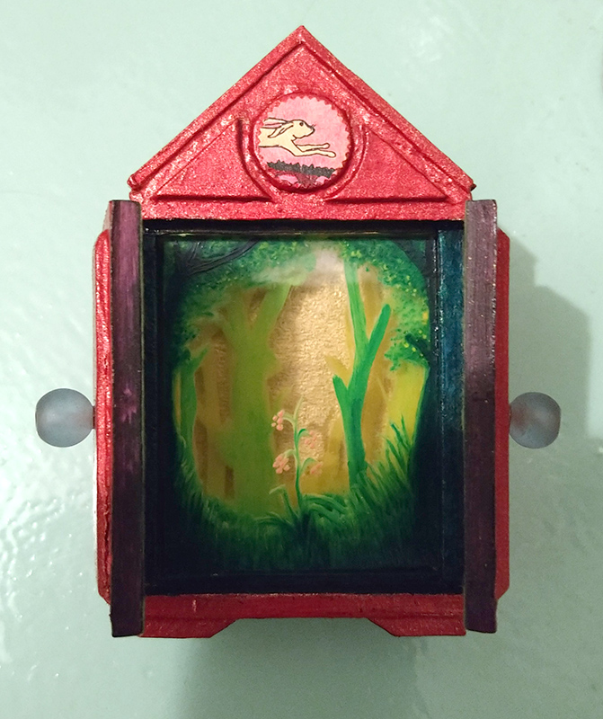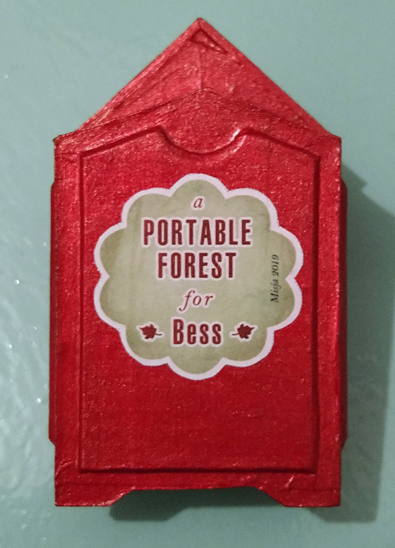Just a tiny little shrine, very much like the ones I made for 21 reliquaries, with a gold backed forest scene, painted on layers of acrylate. Sent to my good friend Bess as she has a thing for forests.